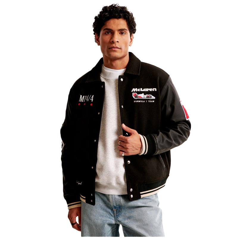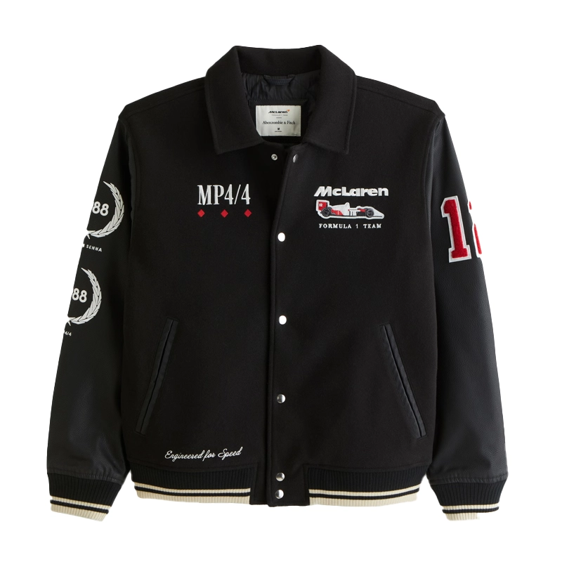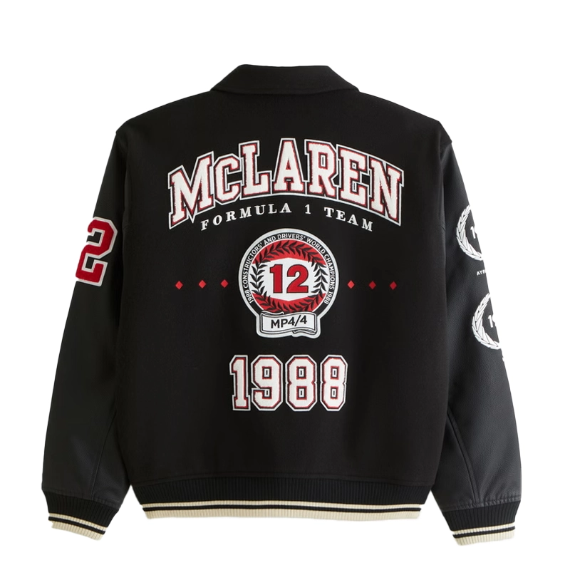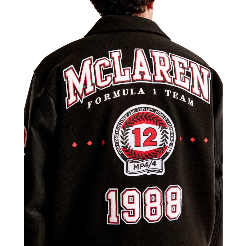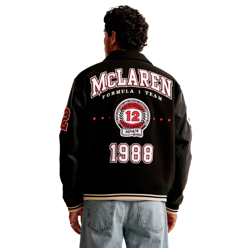 The McLaren Varsity Bomber Black Jacket blends classic varsity aesthetics with premium craftsmanship. Made from high-quality wool fabric with leather sleeves, it offers both warmth and a refined look. The snap tab closure ensures easy wear, while the rib-knitted collar and cuffs provide a comfortable, snug fit. Finished in sleek black, this jacket exudes a bold and sporty vibe, making it a perfect choice for both casual outings and stylish streetwear looks.