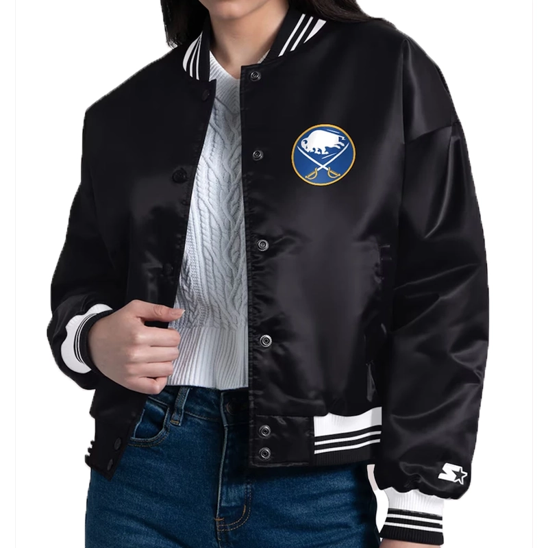 Recreated – Buffalo Sabres Starter Women’s Printed Round Team Logo Satin Varsity Full-Snap Black Jacket